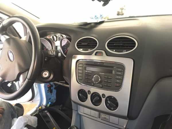 Установка акустической системы в данный автомобиль, давно уже планировалась, и из поставленной задачи мы вытянули максимальный результат, и так у нас есть автомобиль Ford Focus 2-го поколения, с слабой музыкальной начинкой. Вердикт — заменить всю акустику, усилить звук с помощью 4-х канального усилителя и заменить головное устройство на 1 дин магнитолу с нормальным качеством звучания и широкими функциями, так же сделаем полную вибро-шумоизоляцию всех дверей для повышения комфорта пребывания в автомобиле и повышения качества звучания акустики. Как всегда начнем с разбора всего что требуется для протяжки проводки для усилителя, разбора дверей и демонтаж магнитолы.