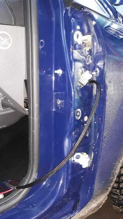 Для протяжки кабелей в двери их пришлось снять. Место прохода кабеля через металл защитили резиновой втулкой и «змеиной кожей».