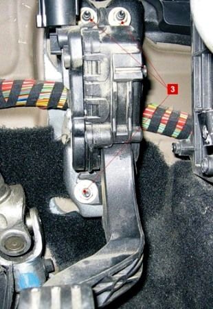 Теперь надо снять педаль газа, она крепится тремя болтами.