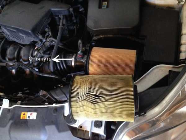 После чего легким движением вверх(тянуть ближе к правой стороне) вытаскиваем старый фильтр, и немного оттянув воздуховод
