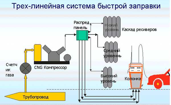 Для того, чтобы увеличить эффективность аккумуляторов сжатого газа и сократить время самой заправки автомобилей, используются много линейные системы. Принцип много линейной системы заключается в том, что хранение сжатого метана производится в нескольких группах ресиверов, которые могут быть заполнены и опорожнены независимо друг от друга. Например, трехлинейная система должна иметь три раздельных каскада, которые можно обозначить тремя уровнями: низкий, средний и высокий уровень. С такой системой приблизительно 35 — 50% сохраненного сжатого газа в ресиверах доступно для заправки машин.