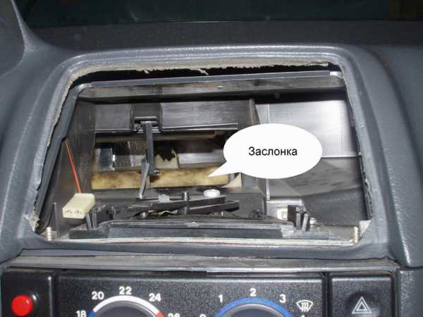 Часто причиной плохой работы отопителя “десятки” становится заслонка печки ваз 2110. Заслонка может не плотно закрываться или плохо открываться. Сама заслонка отопителя изготовлена из пластика, который может со временем деформироваться и плохо работать. Многие автовладельцы покупают металлическую заслонку и меняют её своими силами. Как проверить работоспособность и оценить состояния заслонки печки? Все довольно просто, снимаете центральный дефлектор воздуховода и вот она заслоночка! Смотрим на фото.