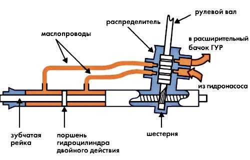 ΠΡΠΈΠ½ΡΠΈΠΏ ΡΠ°Π±ΠΎΡΡ ΡΠΈΡΡΠ΅ΠΌΡ ΠΏΡΠΎΡΡ: ΠΏΠΎΠΊΠ° Π΄Π²ΠΈΠ³Π°ΡΠ΅Π»Ρ ΡΠ°Π±ΠΎΡΠ°Π΅Ρ, Π½Π°ΡΠΎΡ Π³ΠΈΠ΄ΡΠΎΡΡΠΈΠ»ΠΈΡΠ΅Π»Ρ ΡΠΎΠ·Π΄Π°Π΅Ρ Π΄Π°Π²Π»Π΅Π½ΠΈΠ΅ Π² ΡΠΈΡΡΠ΅ΠΌΠ΅ ΡΡΠ»Π΅Π²ΠΎΠ³ΠΎ ΡΠΏΡΠ°Π²Π»Π΅Π½ΠΈΡ, Ρ ΠΏΠΎΠΌΠΎΡΡΡ ΠΊΠΎΡΠΎΡΠΎΠ³ΠΎ ΠΏΡΠΈ ΠΏΠΎΠ²ΠΎΡΠΎΡΠ΅ ΡΡΠ»Ρ ΠΏΠΎΠ΄Π°Π΅ΡΡΡ ΠΆΠΈΠ΄ΠΊΠΎΡΡΡ ΠΊ ΠΎΠ΄Π½ΠΎΠΌΡ ΠΈΠ· ΠΏΠΎΡΡΠ½Π΅ΠΉ Π³ΠΈΠ΄ΡΠΎΡΠΈΠ»ΠΈΠ½Π΄ΡΠ°, Π° ΠΎΠ½ ΡΠΆΠ΅, ΠΏΠΎ Π°Π½Π°Π»ΠΎΠ³ΠΈΠΈ Ρ ΡΠ°Π±ΠΎΡΠΎΠΉ ΠΏΡΠΎΡΡΠΎΠ³ΠΎ ΠΌΠ΅Π΄ΠΈΡΠΈΠ½ΡΠΊΠΎΠ³ΠΎ ΡΠΏΡΠΈΡΠ°, ΠΈ ΠΎΡΡΡΠ΅ΡΡΠ²Π»ΡΠ΅Ρ Π½Π΅ΠΏΠΎΡΡΠ΅Π΄ΡΡΠ²Π΅Π½Π½ΠΎΠ΅ ΠΏΠ΅ΡΠ΅ΠΌΠ΅ΡΠ΅Π½ΠΈΠ΅ ΡΡΠ»Π΅Π²ΠΎΠΉ ΡΠ΅ΠΉΠΊΠΈ. ΠΡΠ»ΠΈ Π½Π°ΠΏΡΠ°Π²Π»Π΅Π½ΠΈΠ΅ Π²ΡΠ°ΡΠ΅Π½ΠΈΡ ΡΡΠ»Ρ ΠΌΠ΅Π½ΡΠ΅ΡΡΡ, ΠΌΠ΅Π½ΡΠ΅ΡΡΡ ΠΈ ΠΌΠ΅ΡΡΠΎ ΠΏΠΎΠ΄Π°ΡΠΈ ΠΆΠΈΠ΄ΠΊΠΎΡΡΠΈ β Π½Π° ΠΏΡΠΎΡΠΈΠ²ΠΎΠΏΠΎΠ»ΠΎΠΆΠ½ΡΡ ΡΡΠΎΡΠΎΠ½Ρ Π³ΠΈΠ΄ΡΠΎΡΠΈΠ»ΠΈΠ½Π΄ΡΠ°. Π’ΠΎ Π΅ΡΡΡ Π±Π΅Π· ΠΆΠΈΠ΄ΠΊΠΎΡΡΠΈ ΡΠ°Π±ΠΎΡΠ° Π΄Π°Π½Π½ΠΎΠ³ΠΎ ΡΠ·Π»Π° ΠΏΡΠΎΡΡΠΎ Π½Π΅Π²ΠΎΠ·ΠΌΠΎΠΆΠ½Π°!