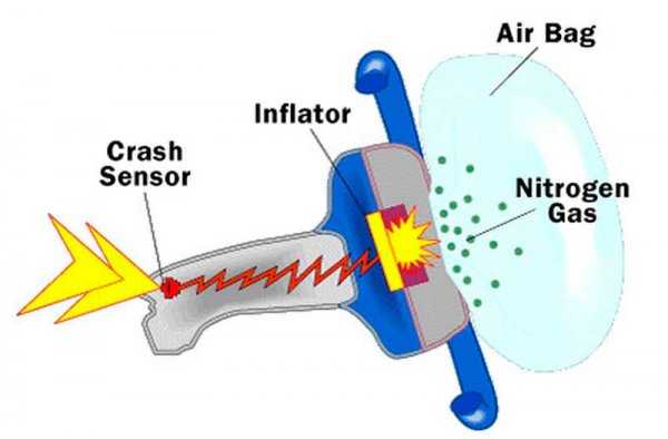 При поступлении этого сигнала внутри пиропатрона произойдет химическая реакция, которая будет сопровождаться выделением большого количества газа, им и наполнится подушка, представляющая собой тканевый мешок с отверстиями.