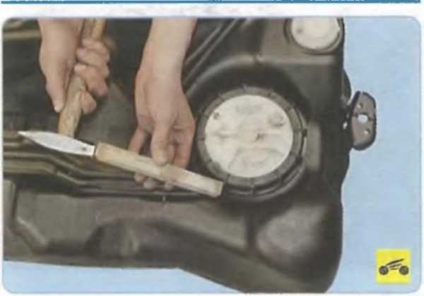 2. Ослабьте затяжку прижимного кольца крепления модуля топливного насоса к топливному баку, проворачивая кольцо против часовой стрелки аккуратными ударами молотка через деревянную выколотку…