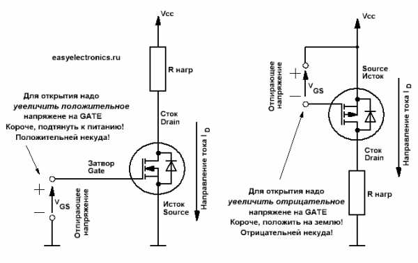 Рассмотрим схемы включения Р и N-канальных транзисторов: