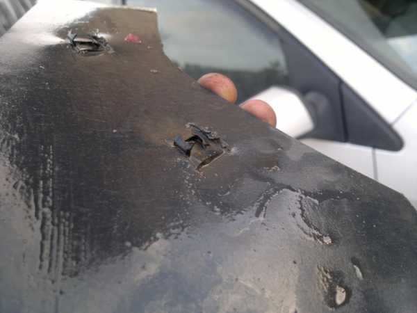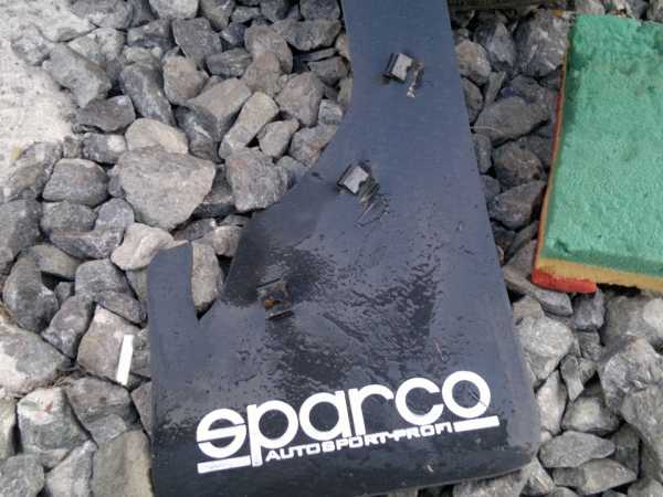 .Взял скобы, типа под саморез, для ВАЗа какогото. Оригинала не осталось, все 6 израсходовал. Чтоб она по форме подходила, загнул их: с лицевой стороны пополам, по отверстию, и заднюю под прямым углом(ну примерно) в ту же сторону. На Спарках разметил места установки этих загагулин, используя как лекало «родной» покореженный брызговик. Потом сделал по 2 прорези по размеру получившейся скрепки. Ну и впихнул их туда пассатижами. Геометрия, думаю, ясна, надо сделать так, чтоб скоба цеплялась за изгиб крыла, как на штатном брызговике. На самом брызговике еще вот эту прорезь сделал, так как там выступ, а этот узкий хлястик попадает так, что его можно засунуть под край подкрылка, и оно еще лучше держится.