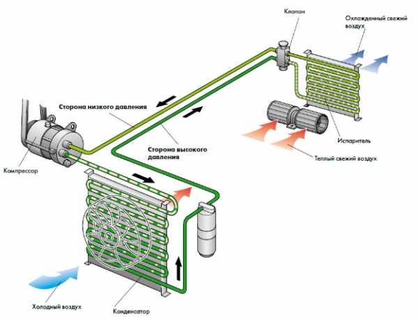Этот холод в дальнейшем и будет использован для охлаждения салона автомобиля. После этого холодные паре поступают на другой радиатор, в нем холод разгоняется вентилятором и попадает в салон машины. Далее хладагент опять поступаем в компрессор и этот цикл теплообмена повторяется.