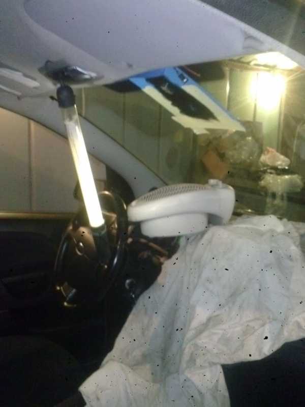 Оказывается его и не так легко найти, из 10 магазинов в одном есть! цена вопроса 60 грн., на стекле клеем шаблон, накрываем торпедо, так как если где то попадет, потом не отмоешь! Ставим теплодуйчика 🙂 для более быстрой реакции