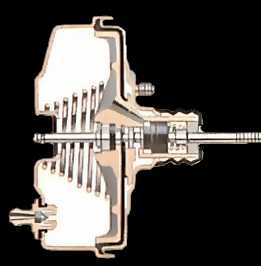 При нажатии на педаль клапан, соединяющий заднюю сторону диафрагмы с коллектором, закрывается, открывая клапан, впускающий воздух извне.