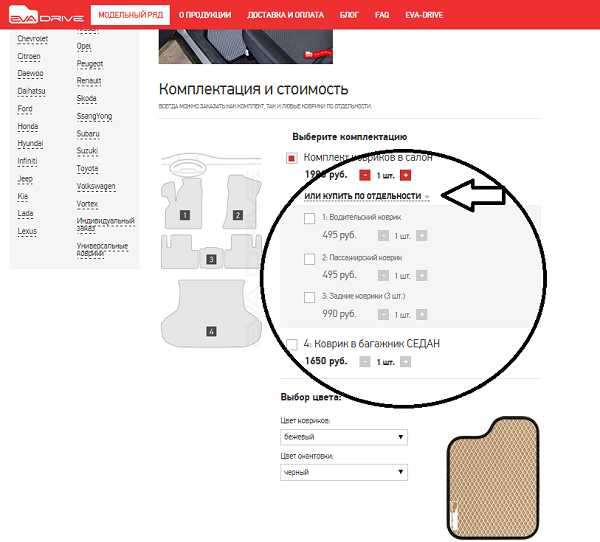 Затемоткроется страничка, как при быстром заказе. Подбираем комплектацию, цвет и добавляем в корзину. Здесь вы увидитеподробную схему расположения ковриков в салоне с фотографиями.