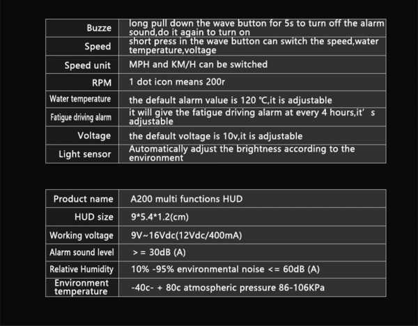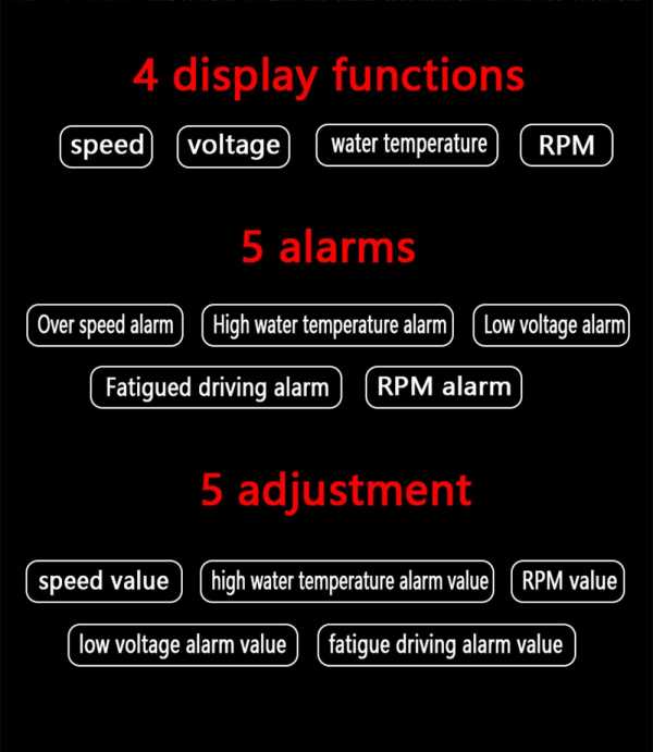 5. богатое содержание: скорость, об/мин, температура воды, напряжение, Сигнализация низкого напряжения, высокая температура воды, сигнал тревоги, Усталость вождения, свободно переключается между километрами и милями.
