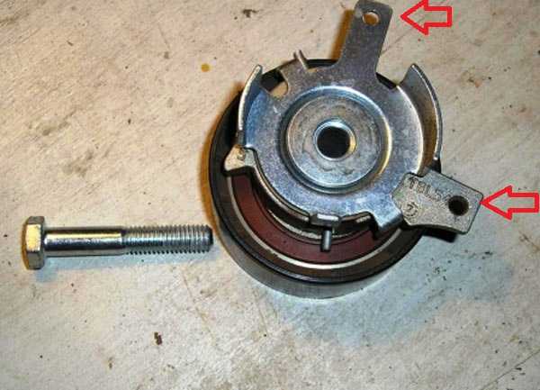 Натяжной ролик ремня ГРМ Форд Фокус 2 очень продуманный и грамотно сделан для удобства демонтажа. На нем есть два, если их свести в месте, а они легко сводятся и рукой, ролик ослабляет ремень. На ушках есть отверстия, сводим ушки так, чтобы оба отверстия совпали и вставляем кусок проволоки или гвоздь, чтобы натяжной ролик оставался в ослабленном положении.