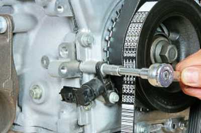 Ставим новый натяжной ролик с новым болтом на место в взведенном положении и средним усилием затягиваем болт.