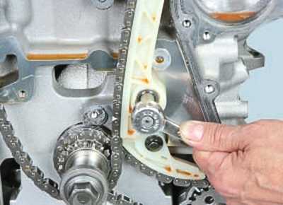 Снимаем успокоитель, после чего уже можно приступать к непосредственному снятию цепи. Проверьте состояние цепи масляного насоса, возможно, ее тоже придется заменить. Для этого отворачиваем болт крепления натяжителя. Затем выкручиваем болт, фиксирующий звездочку масляного насоса и снимаем звездочку. Снимается она вместе с цепью. Обязательно оцените состояние всех звездочек и натяжителей. Если оно окажется неудовлетворительным, то их тоже нужно будет заменить.