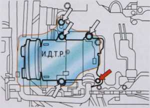 Теперь необходимо снять ремень генераторного привода. Поршень первого цилиндра устанавливается в положение ВМТ. Снимаем шкив и защиту компрессора кондиционера. После этого отводим в сторону компрессор и фиксируем его в этом положении. Снимаем крепление компрессора кондиционера.