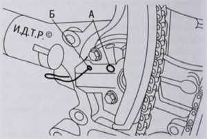 После этого можно начинать снимать цепной привод ГРМ со звездочек распределительного и коленчатого валов. Обязательно проведите осмотр звездочек и замените их, если будут обнаружены дефекты. После этого можно надевать заранее приготовленную новую цепь. Извлеките отвертку из отверстия Б на рисунке выше. Перед посадкой крышки механизма ГРМ нанесите на посадочное место герметик. Посадочное место необходимо предварительно очистить от грязи или следов старого герметика. Установите кожух ГРМ. Все прочие детали устанавливаются от обратного.