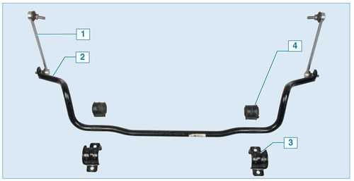 Стабилизатор поперечной устойчивости: 1 — стойка; 2 — штанга; 3 — кронштейн; 4 — подушка