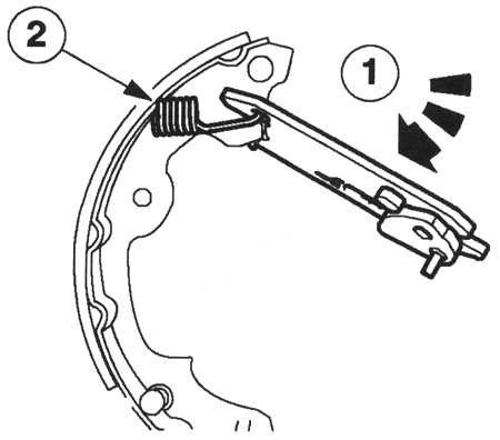 | 5. Через большое отверстие во фланце барабана в отверстие «носка» передней колодки вставить стержень диаметром 8 мм. |