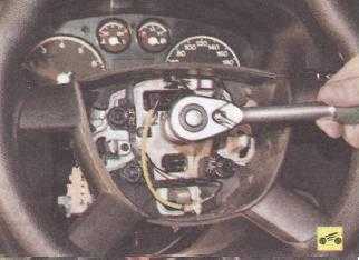 Головкой «на 24» с удлинителем отворачиваем болт крепления рулевого колеса к валу.