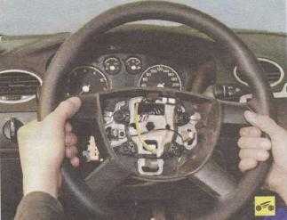Поворачивая руль в нужное положение, отжимаем оставшиеся два крепления подушки (для наглядности показано на снятом рулевом колесе).