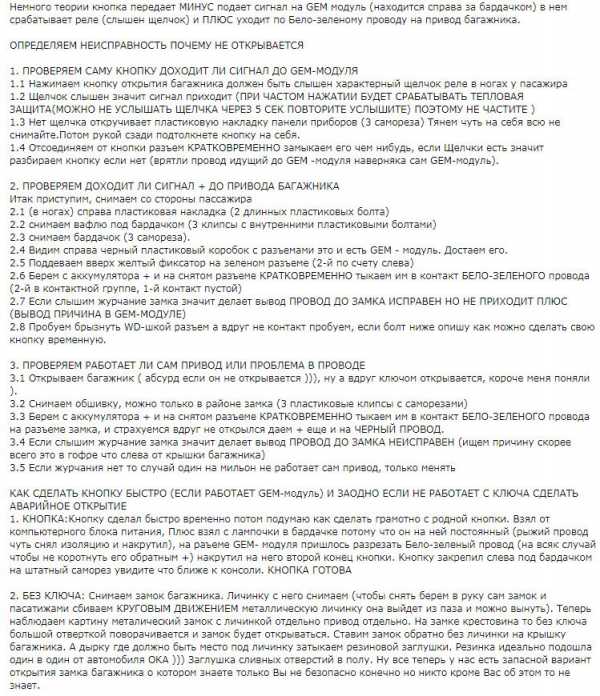 При покупке авто не открывался багажник с кнопки, релешка щелкала в ногах пассажира, но замок не открывался, только с ключа. Почитав в интернете как это лечится, решил и сам сделать, все-таки в машине должно все работать, а уж багажник и подавно.