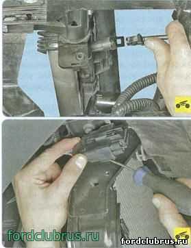 6. отсоедините шланг отвода охлаждающей жидкости в расширительный бачок.7. Поддев отверткой, сдвиньте колодку жгута проводов вперед по ходу движения автомобиля…