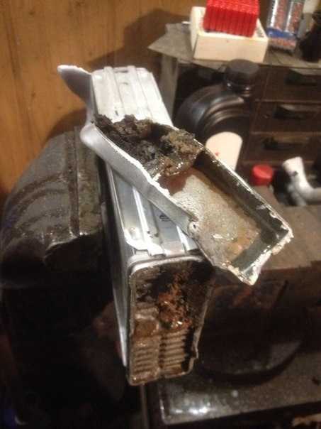 Шутка) Говна, а по-другому я это назвать не могу, в нём было просто немерено. На фото запечатлена лишь часть, потому как другая часть вывалилась, когда разрезали. Он оказался забит наглухо. Продуть/промыть его не было ни малейшей возможности. Вот как то так) Хорошо, что новый радик достался нахаляву)