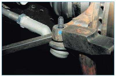 Нанося удары молотком по проушине рычага, одновременно нажимаем монтажной лопаткой на рулевую тягу вниз.