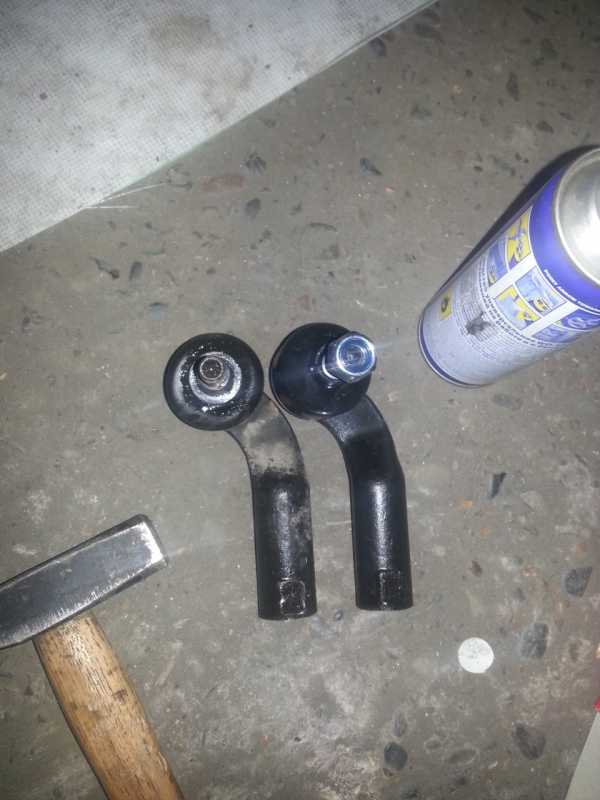 В букварях всегда пишут, что для того, что бы вытащить «палец» наконечника из поворотного кулака, необходимо открутить с него гайку (накидным ключем и шестигранным), а потом надавив на «шейку» наконечника, постукивая по проушине поворотного кулака — выбиваем наконечник. В моем случае — старый наконечник возвращать на место не будем, выбить описанным способом вообще не как не получилось. Гайку открутил практически до конца и оставив ее чуть выше, чем начало резьбы «пальца», весело и с матерной песней выбил наконечник.
