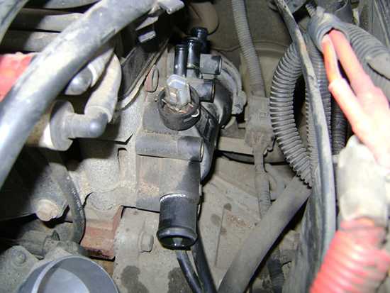 6. Выверните четыре болта крепления корпуса термостата к блоку цилиндров и снимите термостат.