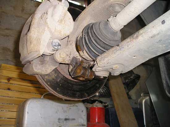Чтобы найти щель поворотного кулака, выбиваем болт и прокручиваем термоэкран. Берем монтировку и кувалду, разжимаем поворотный кулак.