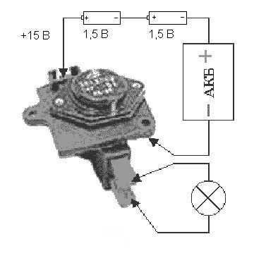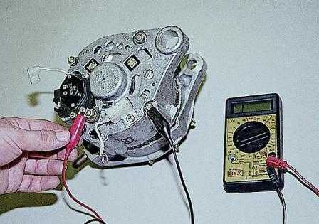 Для проверки обмотки возбуждения на обрыв щупами мультиметра дотрагиваются до колец ротора при снятом щеточном узле — рабочая обмотка показывает небольшое сопротивление. При касании одного щупа к кольцу, а другого к валу или корпусу ротора проверяют наличие замыкания обмотки на «массу». Для проверки реле-регулятора напряжения к верхнему контакту подсоединяют «+» АКБ, а к левому — «-» и измеряют напряжение на щетках. Оно должно быть 12 В. Если нет — реле подлежит замене.