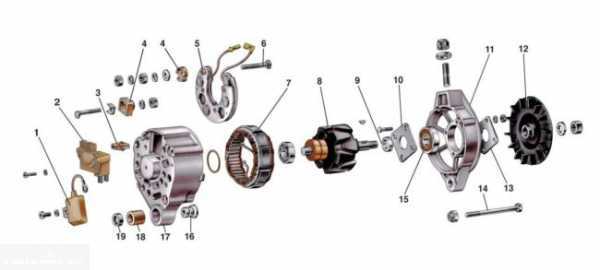 Детали генератора 37.3701: 1 – конденсатор; 2 – регулятор напряжения в сборе с щеткодержателем; 3 – колодка вывода дополнительных диодов; 4 – изолирующие втулки; 5 – выпрямительный блок; 6 – контактный болт; 7 – статор; 8 – ротор; 9 – дистанционная втулка; 10 – внутренняя шайба крепления подшипника; 11 – крышка со стороны привода; 12 – шкив; 13 – наружная шайба крепления подшипника; 14 – стяжной болт; 15 – передний шарикоподшипник ротора; 16 – втулка; 17 – крышка со стороны контактных колец; 18 – буферная втулка; 19 – поджимная втулка.