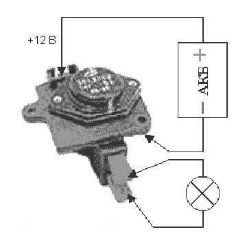 Подключаем лампочку и АКБ к реле -регулятору как показано на рисунке ниже. В этом случаи лампа должна гореть.