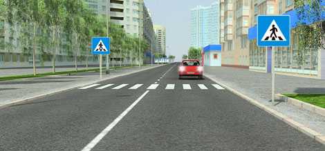 Как видно из рисунка выше, пешеходный переход обозначен с помощью дорожных знаков «Пешеходный переход» (5.19.1 и 5.19.2). При этом ширина перехода – это расстояние между знаками.