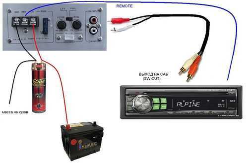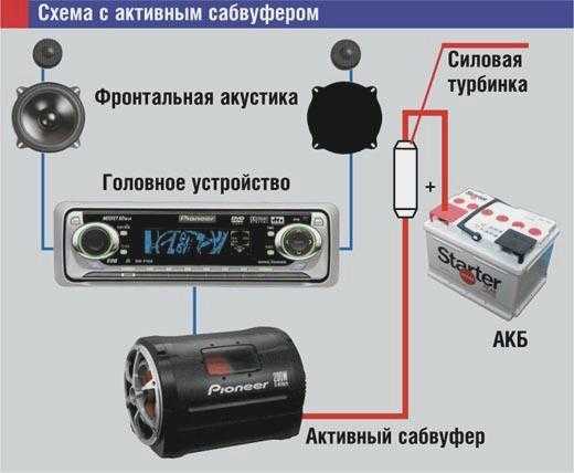 Подключение сабвуфера активного типа выполняется к магнитоле через высокоамплитудные выходы встроенного усилителя, при отсутствии там линейных контактов. Управляющий кабель конектится на соответствующее гнездо сабвуфера. Общая схема акустической установки включает в себя коммутацию с высокоамплитудным входом вмонтированного усилителя.