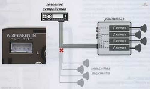 Подключение без усилителяПодключить усилитель к магнитоле без линейного выхода, также не сложно. Для этого понадобится специальный адаптер, купить который можно в любом магазине авто запчастей. Стандартный преобразователь уровня сигнала (адаптер) имеет четыре контактных провода, которые подсоединяются к проводам, идущими на колонки от автомобильного проигрывателя и на два выходных штекера — тюльпана.