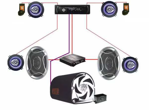 Сигнал от штатной магнитолы поступает на усилитель, а с него распределяется на динамики и сабвуфер