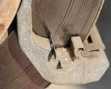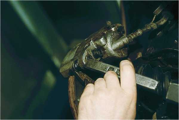 2. Далее в направлении направляющего пальца отгибается стопор крепежного болта, фиксирующего скобу суппорта. При этом тормозной шланг нужно из скобы вынуть, чтобы он не мешал.