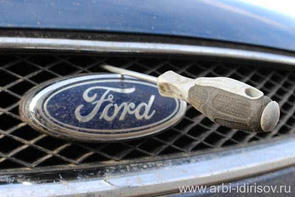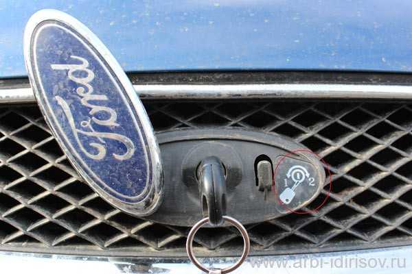 Как уже было сказано выше, чтобы открыть капот, необходимо взять ключ зажигания и вставить его в замок, который находится за значком Форд в верхней части решетки радиатора. Повернуть ключ необходимо в левую сторону. Далее нужно выполнить следующее: