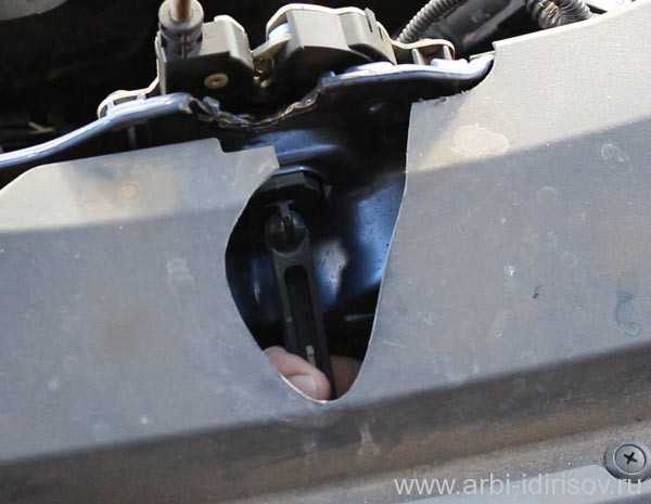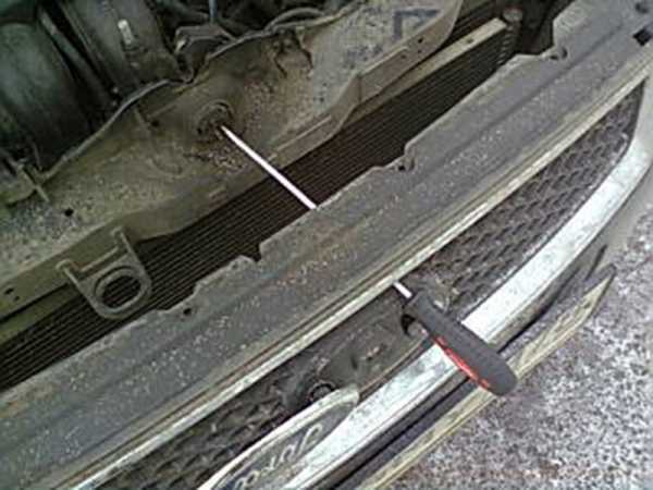 Теперь, чтобы произвести установку новой тяги, нужно снять пластиковую защиту сверху решетки радиатора, крепится она на 6и клипсах, поддеваем отверткой винты, достаем их и потом вытаскиваем клипсу.