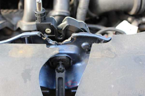 Смотрим фото выше. Поскольку решетка радиатора находится далеко от самого замка капота, в то время, когда мы крутим ключ, мы крутим вот эту (красная стрелка) тягу, которая, собственно и открывает замок. Как правило ломается личинка замка капота. Люди, как правило тут же бегут с криком — сломался замок капота, купить замок капота форд фокус! Но, ломается, ни замок,ни тяга не сломаны, эта тяга (на фото выше) просто выскакивает из паза.