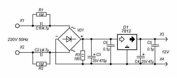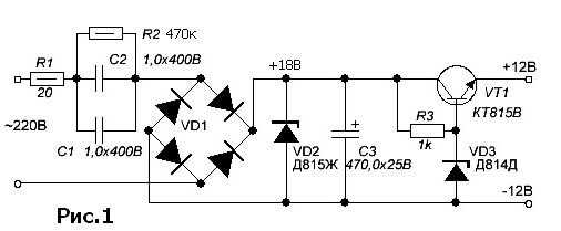 R1 – нужен для разрядки гасящего конденсатора, C1 – основной элемент, гасящий конденсатор, R2 – ограничивает токи при включении схемы, VD1 – диодный мост, VD2 – стабилитрон на нужное напряжение, для 12 вольт подойдут: Д814Д, КС207В, 1N4742A. Можно использовать и линейный преобразователь.