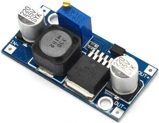 Эффективнее использовать импульсные понижающие преобразователи напряжения, например на базе ИМС LM2596. На плате подписаны контактные площадки In (вход +) и (- Out выход) соответственно. В продаже можно найти версию с фиксированным выходным напряжением и с регулируемым, как на фото сверху в правой части вы видите многооборотный потенциометр синего цвета.