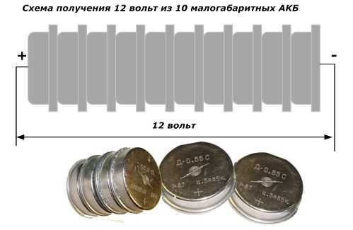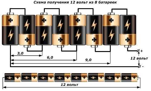 Промышленность выпускает круглые батарейки различных габаритов (зависят от мощности) с напряжением 1,5 вольта. Если взять 8 штук, то из них при последовательном подключении как раз получится 12 вольт.