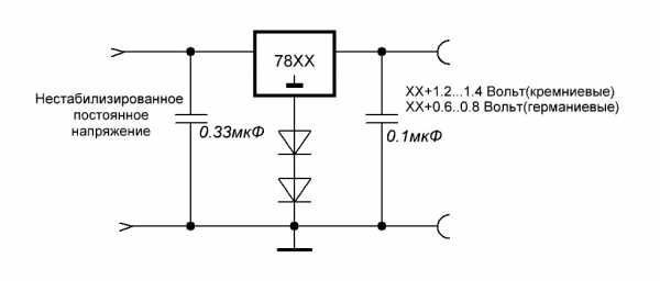 Что мы в результате видим? Видим стабилизатор напряжения и стабилитрон, подключенный к среднему выводу стабилизатора. ХХ — это две последние цифры, написанные на стабилизаторе. Там могут быть цифры 05, 09, 12 , 15, 18, 24. Может уже есть даже больше 24. Не знаю, врать не буду. Эти две последние цифры говорят нам о напряжении, которое будет выдавать стабилизатор по классической схеме включения: