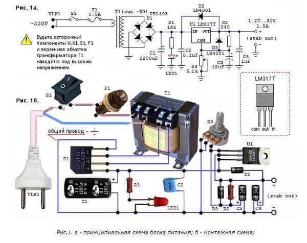 Также хочется добавить схему регулируемого БП на LM317. С его помощью вы можете получить любое напряжение от 1,1 В до величины выпрямленного напряжения с трансформатора.
