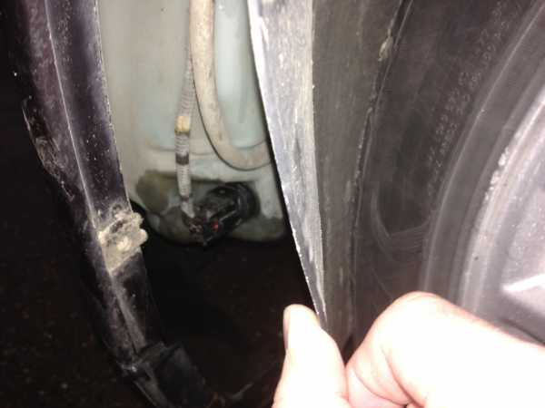 Значит сливаем: выворачиваем колеса до упора направо, откручиваем 4 винта подкрылок-бампер, отгибаем этот подкрылок и видим датчик уровня жидкости в бачке