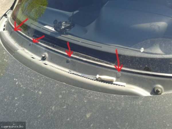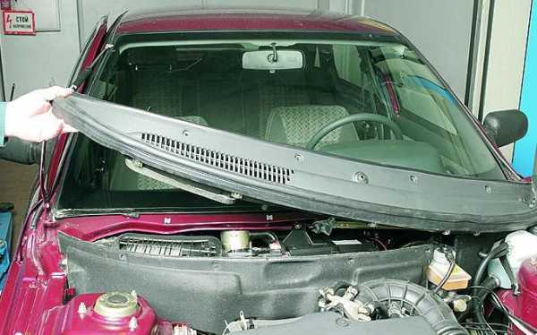 6) Следом после выворачивания всех винтов, всех гаек, аккуратно возьмите за ветровую накладку и положите её на двигатель автомобиля чтобы не мешала.